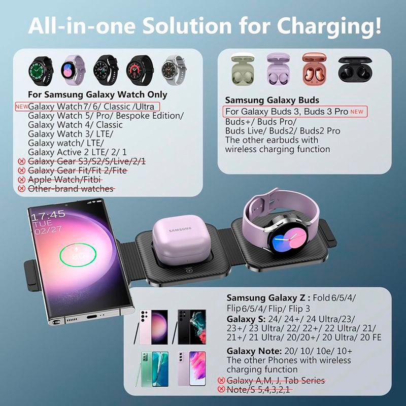 Este carregador 3 em 1 é projetado para oferecer máxima conveniência. Com ele, você pode carregar seu smartphone, smartwatch e fones de ouvido sem fio simultaneamente. Não é necessário levar vários cabos e adaptadores; apenas um dispositivo compacto que atende a todas as suas necessidades de carregamento.