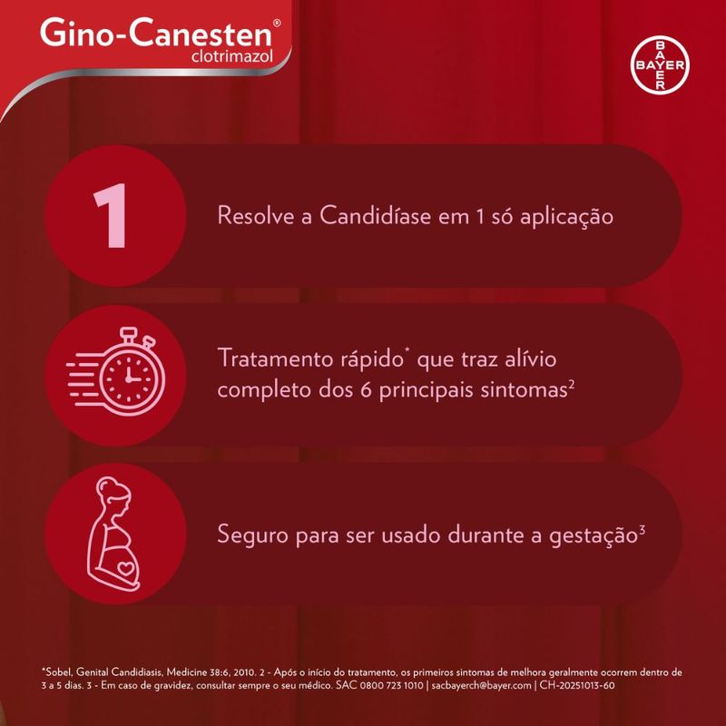 Gino-Canesten® (clotrimazol) cápsula vaginal é indicado para o tratamento de candidiase vaginal (infecção causada por fungos, do gênero Candida, localizada na área genital, cujo sintoma mais evidente é o aparecimento de corrimento. Esse corrimento é caracterizado por ser esbranquiçado, semelhante ao aspecto de leite talhado e geralmente acompanhado de coceira). O tratamento com Gino-Canesten® (clotrimazol) cápsula vaginal é indicado em pacientes sem infecção por Trichomonas vaginalis.