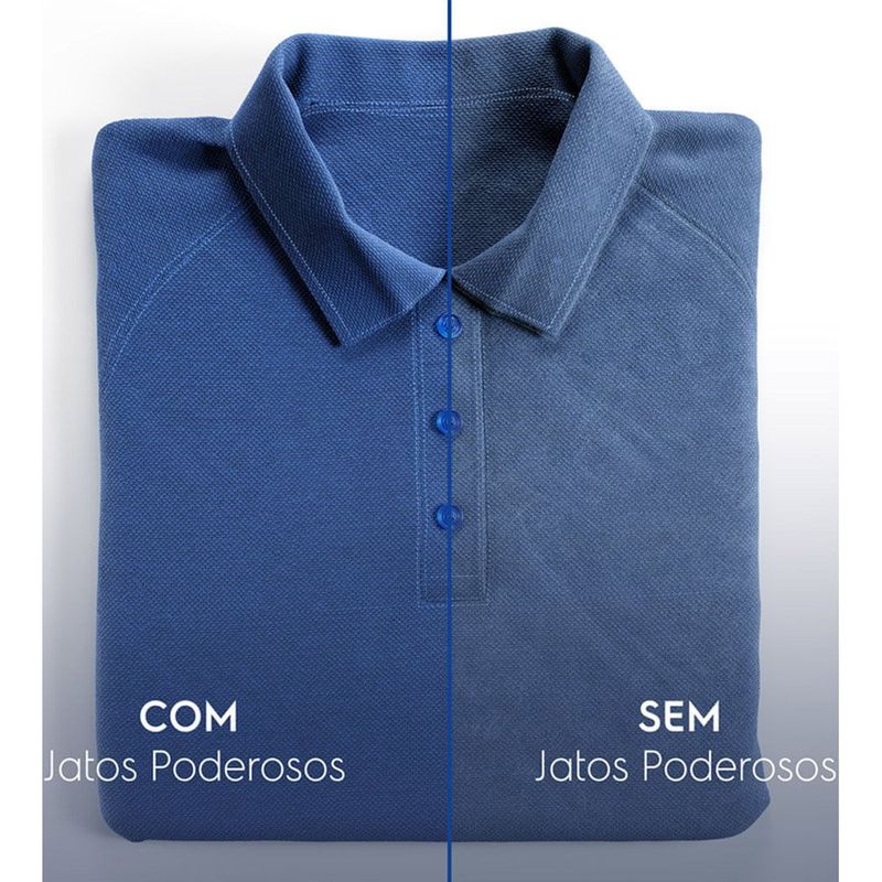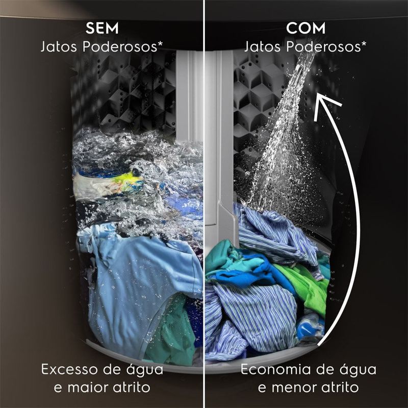 Jatos Poderosos e Dual Filter: Lavagem sem agitação, economiza até 72 litros de água e 8% de energia por ciclo, com até 90% menos desgaste e 50% menos desbotamento das roupas.