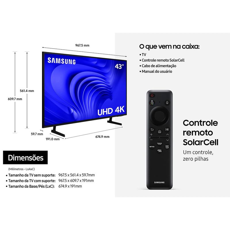 Com Alexa integrada, a Samsung 70DU7700 oferece conveniência e conectividade inteligente. Você pode usar comandos de voz para controlar a TV, buscar conteúdos, ajustar configurações e até mesmo controlar outros dispositivos domésticos inteligentes, tornando sua experiência de uso mais prática e interativa.