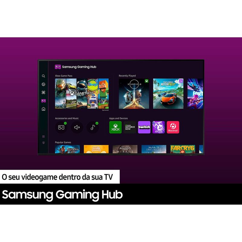 O Gaming Hub da Samsung transforma a 70DU7700 em uma central de entretenimento para gamers. Com acesso rápido e fácil a uma variedade de jogos, a TV oferece uma experiência de jogo fluida e sem interrupções. A baixa latência e a alta taxa de atualização garantem uma vantagem competitiva e uma experiência de jogo mais envolvente.