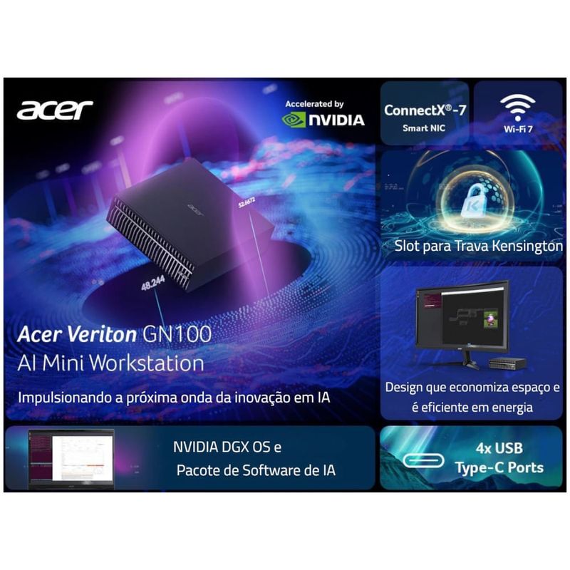 A Workstation IA Acer Veriton GN100 foi desenvolvida para atender demandas de alto desempenho em criação, análise de dados e aplicações de Inteligência Artificial. Equipada com a GPU NVIDIA GB10 Grace™ Blackwell Superchip e arquitetura robusta, oferece excelente capacidade de processamento gráfico e multitarefas, garantindo eficiência para profissionais que buscam desempenho avançado.