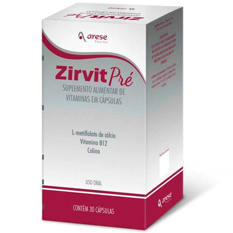 Zirvit Pré é um suplemento vitamínico de fórmula exclusiva, composto por L-Metilfolato de Cálcio, Vitamina B12 (cianocobalamina) e é o único do mercado com a maior dosagem de Colina (250mg).